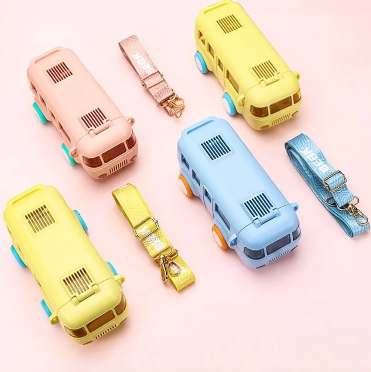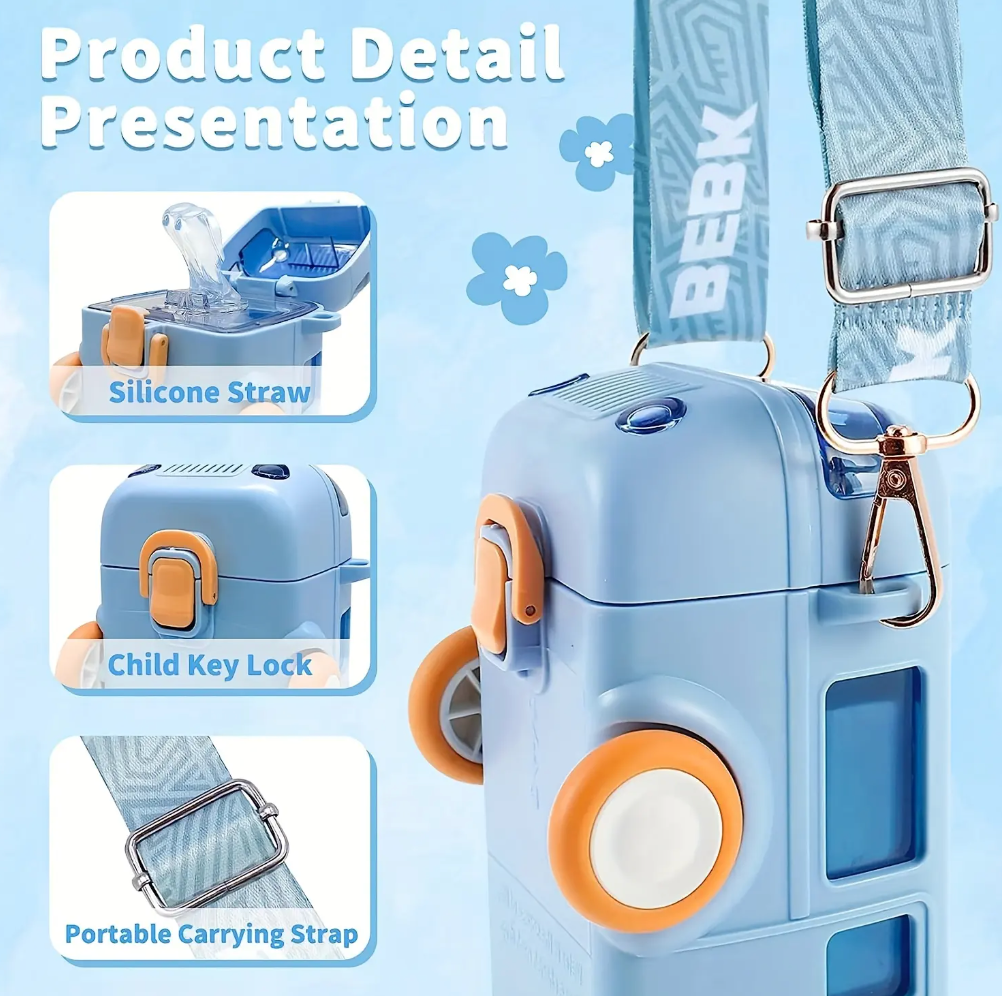 The standout feature of this bottle is its delightful retro bus shape that instantly captures children’s attention. With working wheels, vibrant pastel colors (like lemon yellow and sky blue), and a detailed front that mimics a classic minibus, this bottle feels more like a toy than a utility item — making hydration irresistibly fun.